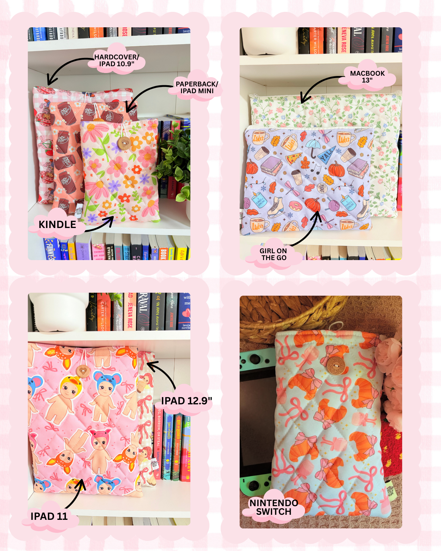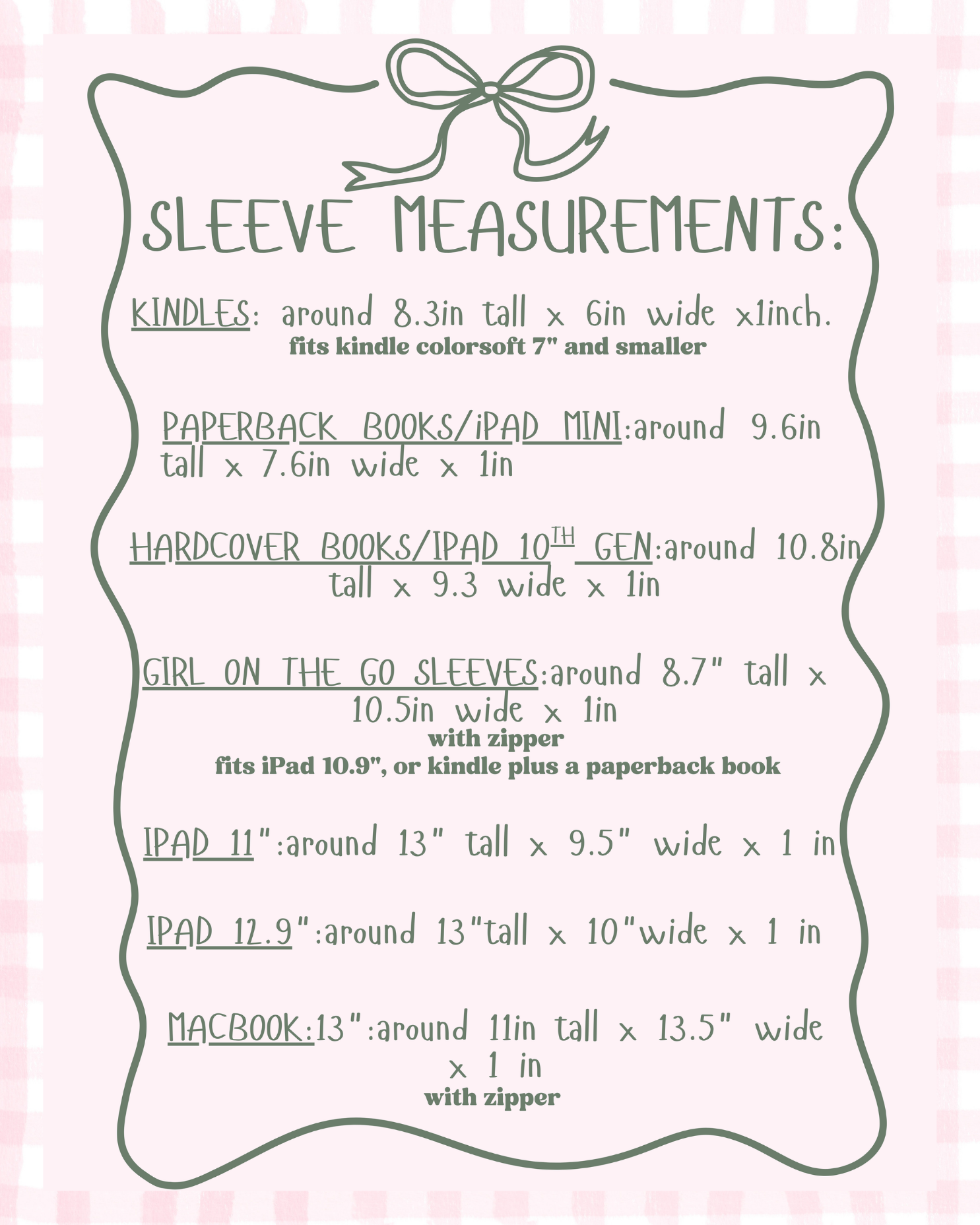 GIRL ON THE GO SLEEVES: around 8.7" tall x 10.5in wide x 1in (fits iPad 10.9", or kindle plus a paperback book)